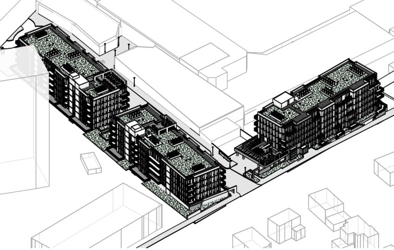 On the lot, there is one active new building construction project, Q01230197, for a 99-unit, 88,165 square-foot R-2 building. The project was submitted by Cord Meyer Development Company and filed by Kathleen Marchiella with plans filed June 23, 2025 and it has not been permitted yet. The developer has also proposed a 46-unit project on the same tax parcel under job number Q01129971.